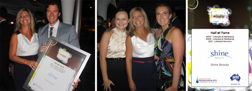 Shine Beauty inducted into the Hall of FameSunshine Coast, Excellence in Business Awards Ceremony On Saturday 10th of November 2012 at the Sunshine Coast, Excellence in Business awards ceremony, was held. It was a very special evening at the Innovation Centre and we all shared in the excitement as our regional business community came together to showcase and celebrate its wonderful efforts and achievements. At the ceremony Shine Beauty was announced as a 2012, Hall of Fame inductee. In recognition of the businesses past outstanding multi award winning achievements. Shine Beauty has in previously years won the prestigious Lifestyle and Wellbeing, Excellence in Business award on three occasions - 2007 winners, 2008 winners & 2011 winners.